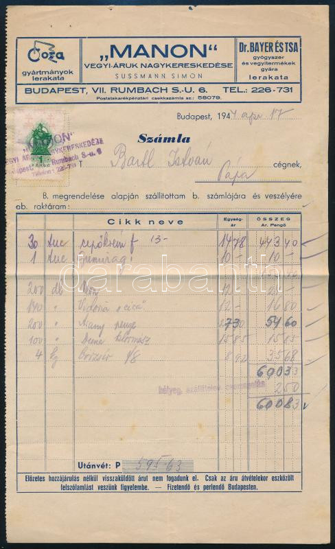 1944 Bp. VII., "Manon" Vegyi-árúk nagykereskedése, Budapest, VII. Rumb... https://www.darabanth.com/de/450-Fernauktion/450.0/Kunst-Dokumente-andere-Sammelgebiete/Dokument~500022/1944-Bp-VII-Manon-Vegyi-aruk-nagykereskedese-Budapest-VII-Rumbach-S-u6-fejleces-szam~II2988356
