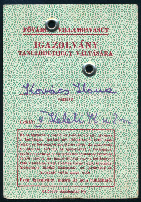 1961 Fővárosi Villamosvasút fényképes bérlete https://www.darabanth.com/de/450-Fernauktion/450.0/Kunst-Dokumente-andere-Sammelgebiete/Dokument~500022/1961-Fovarosi-Villamosvasut-fenykepes-berlete~II2989296