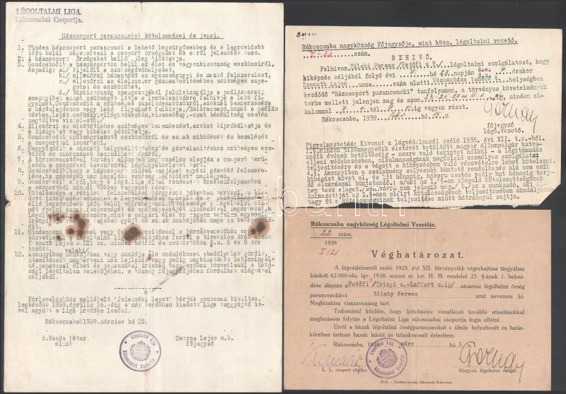 cca 1919-1943 Vegyes okmány tétel ugyan annak a személynek a részére, későbbi karpaszományos t. őrvezető, Rákoscsabai lakos részére, 8 db, közte katonai igazolványi lap, kimaradási engedély, légoltalmi liga papírok (4 db), közte két 1919-es igazolással, hogy Rákoscsabai lakos két bakancsot kapott a községházán, aminek jogos így jogos tulajdonosa, közte foltos.