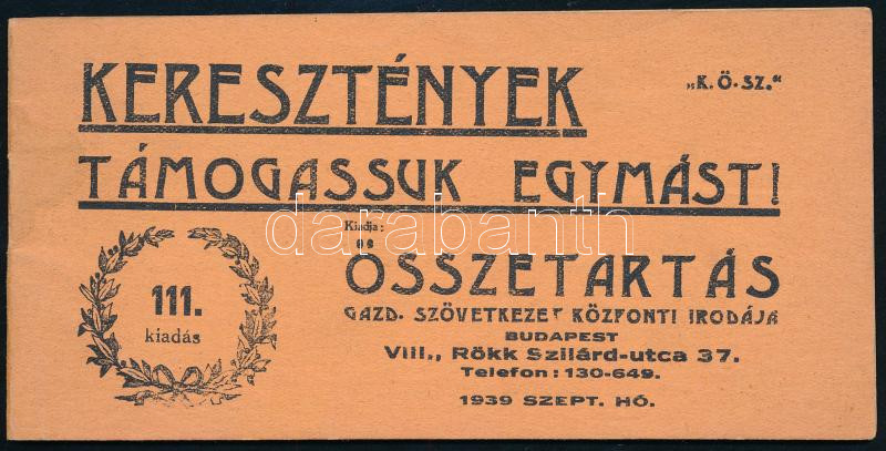 1939 "Keresztények támogassuk egymást!" - az Összetartás Gazd. Szövetk... https://www.darabanth.com/de/450-Fernauktion/450.0/Kunst-Dokumente-andere-Sammelgebiete/Drucksachen~2000024/1939-Keresztenyek-tamogassuk-egymast-az-Osszetartas-Gazd-Szovetkezet-oszi-propaganda-fC3~II2990513