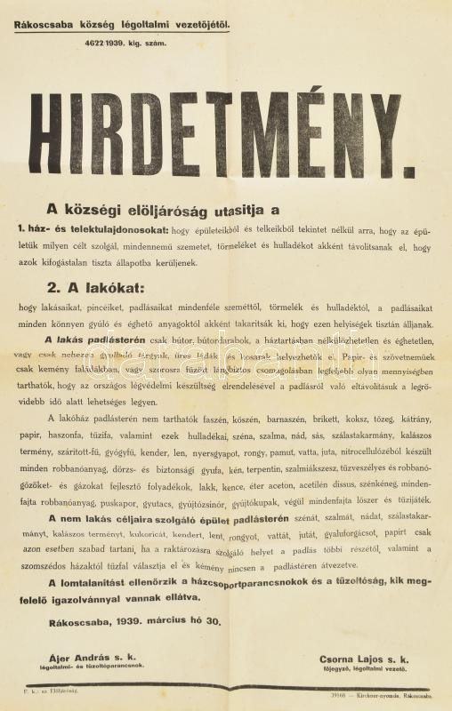 1939 Rákoscsaba légoltalmi hirdetmény plakátja 32x50 cm https://www.darabanth.com/de/450-Fernauktion/450.0/Kunst-Dokumente-andere-Sammelgebiete/Drucksachen~2000024/1939-Rakoscsaba-legoltalmi-hirdetmeny-plakatja-32x50-cm~II2988315