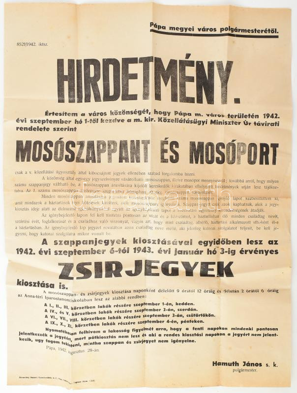 1942 Pápa, a polgármester által kiadott hirdetmény mosószappan és mosó... https://www.darabanth.com/de/450-Fernauktion/450.0/Kunst-Dokumente-andere-Sammelgebiete/Drucksachen~2000024/1942-Papa-a-polgarmester-altal-kiadott-hirdetmeny-mososzappan-es-mosopor-ugyeben~II2988989