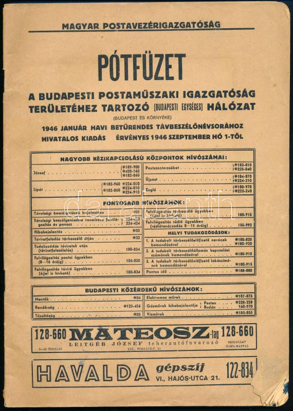 1946 M. Posta távbeszélő névsorhoz való pótfüzet 1946. január 62p. https://www.darabanth.com/de/450-Fernauktion/450.0/Kunst-Dokumente-andere-Sammelgebiete/Drucksachen~2000024/1946-M-Posta-tavbeszelo-nevsorhoz-valo-potfuzet-1946-januar62p~II2990979