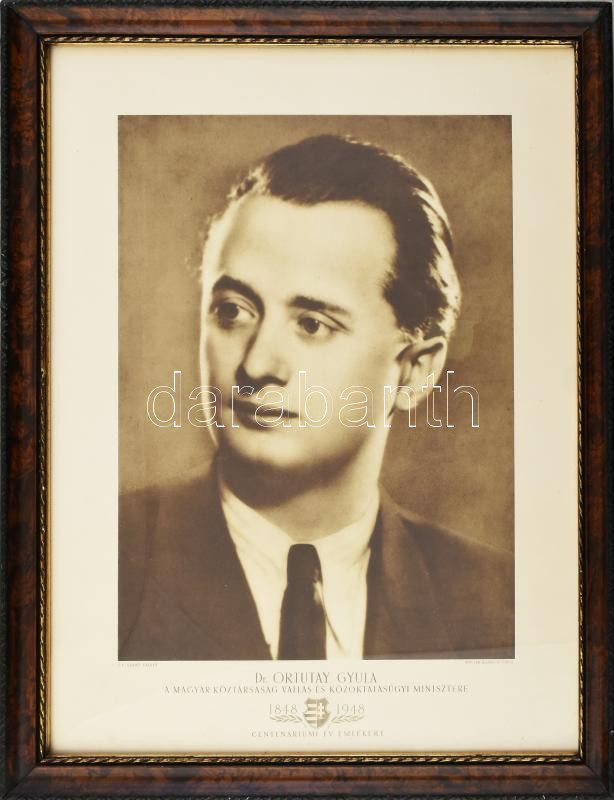 1948 Ortutay Gyula (1910-1978) vallás- és közoktatásügyi miniszter (1947-1950) arcképe, fotó után készült nyomat, lap alján díszes Kossuth-címeres felirattal a centenáriumi év emlékére 1848-1948, Magyar Állami Nyomda, üvegezett fakeretben, 43x33 cm