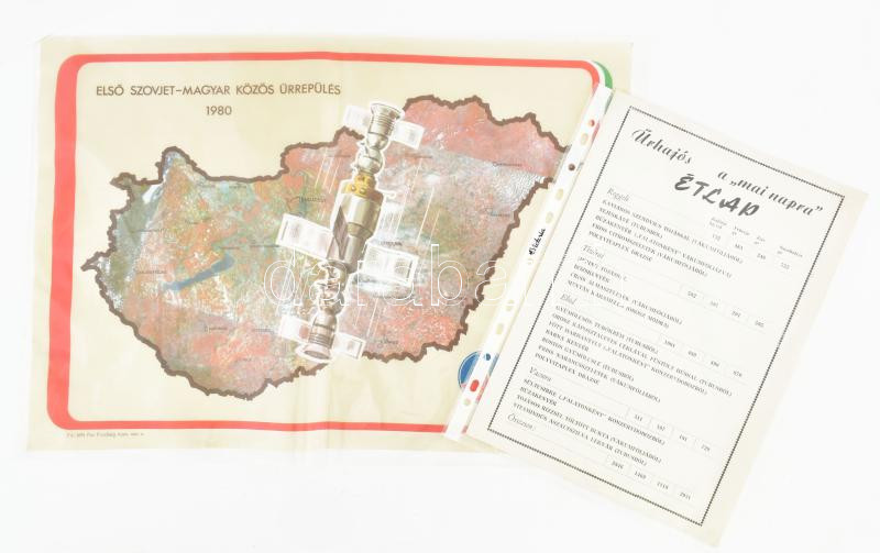Beschreibung: 1980 Első Szovjet-Magyar Közös Űrrepülés szövetre nyomott térkép, 47x32,5 cm + Űrhajós étlap, 29,5x21 cm