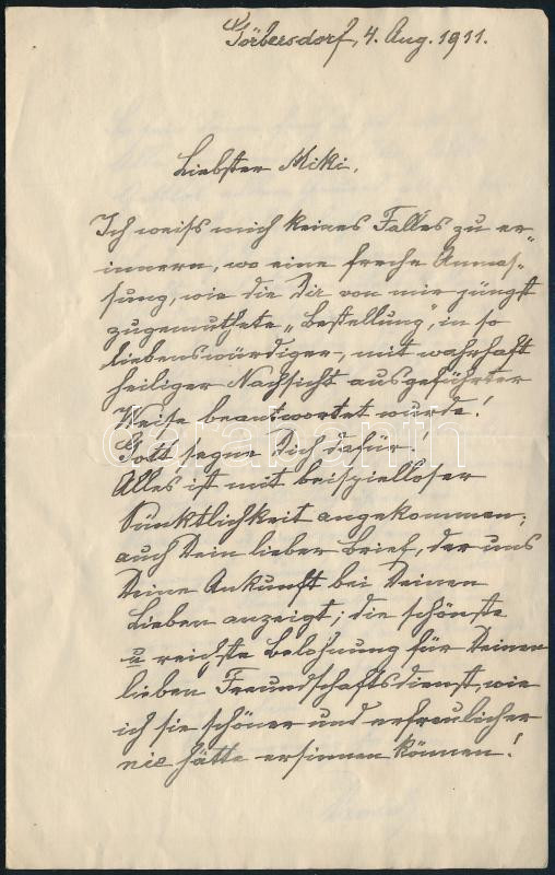 Beschreibung: 1911 Popper Dávid (1843-1913) gordonkaművész saját kézzel írt levele, német nyelven, autográf aláírásával, 2 beírt oldal.