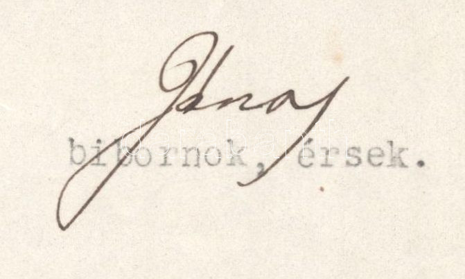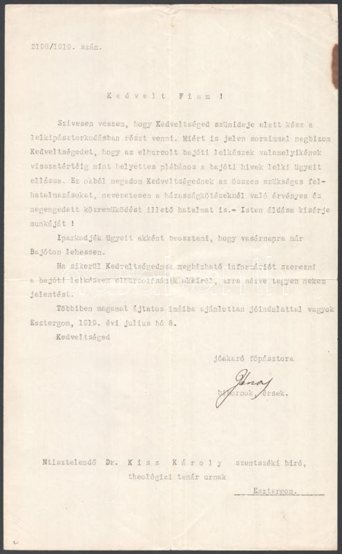 1919 Csernoch János (1852-1927) bíboros saját kézzel aláírt levele dr. Kiss Károly esztergomi teológiai tanárnak, melyben megbízza, hogy a Bajót községből elhurcolt lelkészek helyett plébánosként a helyi egyházi ügyeket ellássa, hajtva, jó állapotban