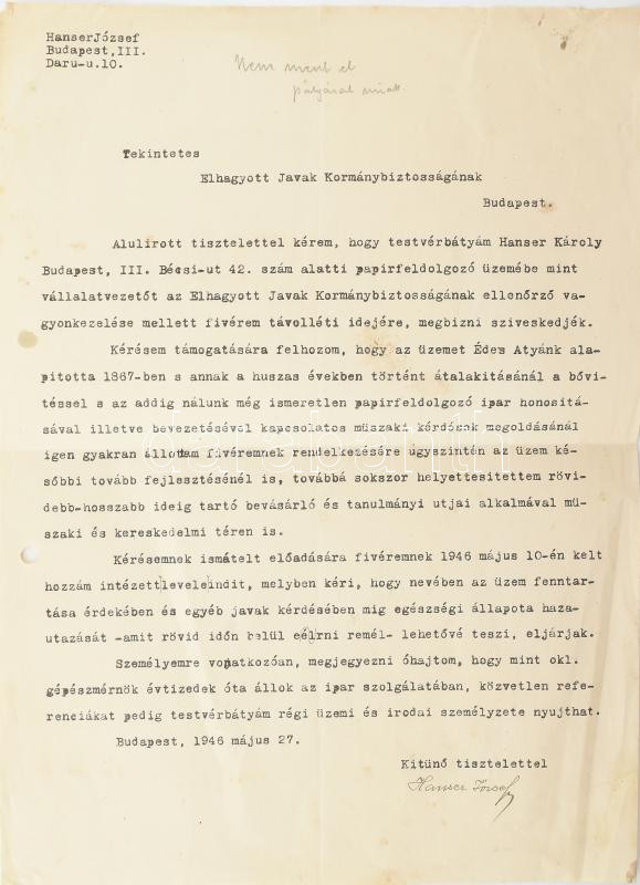 1946 Bp., Hanser József autográf aláírással ellátott, gépelt levele az Elhagyott Javak Kormánybiztossága részére, amelyben testvére, Hanser Károly budapesti papírfeldolgozó üzemébe való ideiglenes vállalatvezetői megbízását kérvényezi bátyja távollétében.