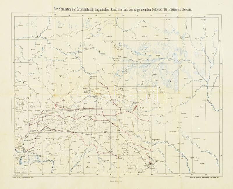 1903 Der Nordosten der Österreichisch-Ungarischen Monarchie mit den angrenzenden Gebieten des Russischen Reiches / Az Osztrák-Magyar Monarchia északkeleti részének és az Orosz Birodalom szomszédos területeinek térképe, 1 : 2.000.000, K. u. k. militär-geographisches Institut, kisebb lapszéli szakadásokkal, 67,5x49,5 cm