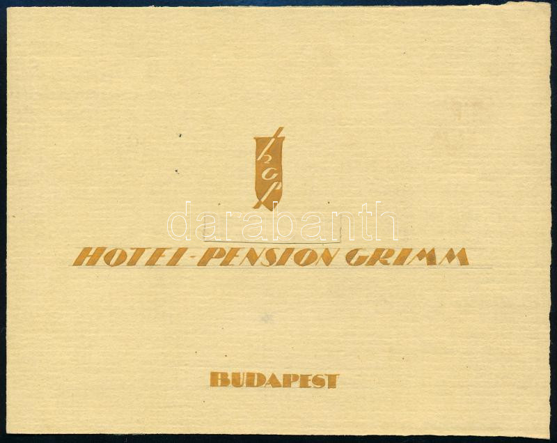 Hotel Pension Grimm. Art deco reklám terv, 1925-30 körül. Tempera, ceruza, papír. Jelzés nélkül, feltehetően Galambos Margit (?-?) grafikus alkotása. 12x15,5 cm