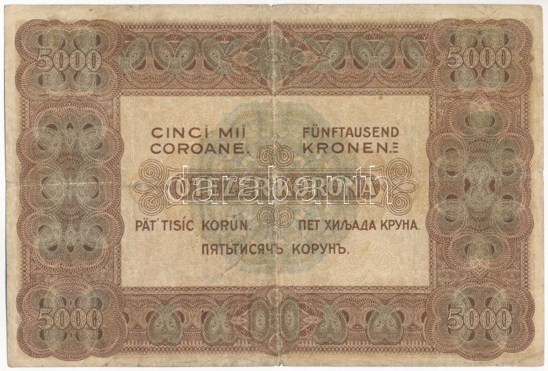 Beschreibung: 1920. 5000K piros "5B03 929168" sorszámmal, "Orell Füssli Zürich" nyomdahely jelöléssel T:VG felső sarkoknál tűnyom, hajtás mentén kis ly.