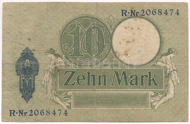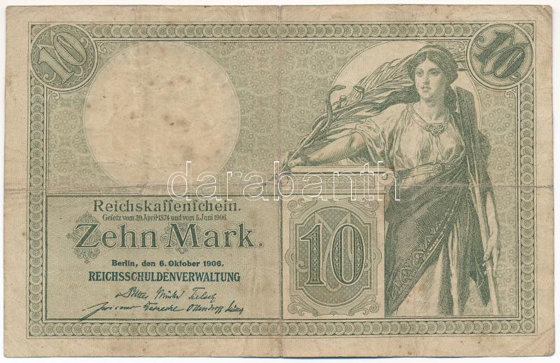 Német Birodalom 1906. 10M hét számjegyű sorszám T:VG fo. German Empire... https://www.darabanth.com/de/450-Fernauktion/450.0/Numismatik/Weltweit-Banknoten~2000013/Nemet-Birodalom-1906-10M-het-szamjegyu-sorszam-TVG-fo-German-Empire-1906-10-Mark-seven-digi~II2987756