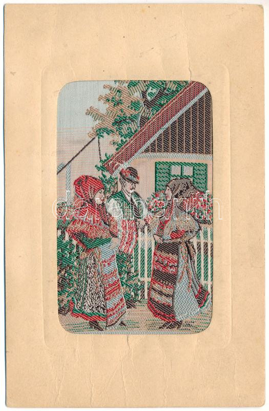 Beschreibung: Mezőkövesdi népviselet, magyar folklór. Grainer-féle gobelin képek / Hungarian folklore from Mezőkövesd, textile card (gyűrődések / creases)