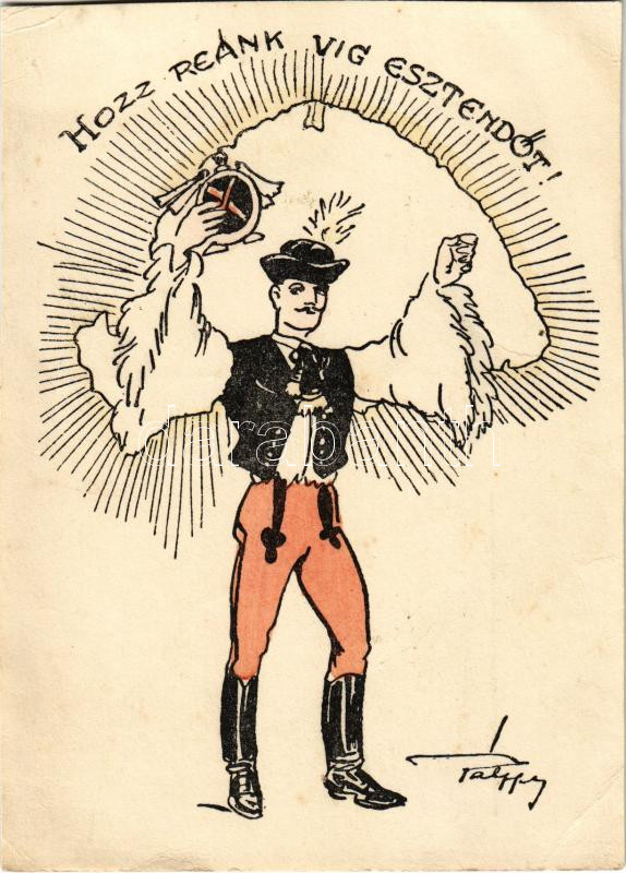 Beschreibung: Hozz reánk víg esztendőt! / Hungarian irredenta propaganda, New Year greeting card, folklore s: Pálffy (vágott / cut)