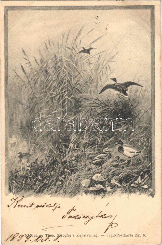 Beschreibung: 1899 Ducks, hunter art postcard. Theo. Stroefer's Kunstverlag Jagd-Postkarte Nr. 6.