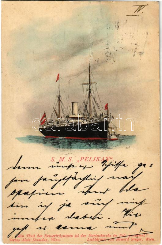 1899 (Vorläufer) SMS PELIKAN az Osztrák-Magyar Haditengerészet parancsnoki yachtja és torpedó-raktárhajója / SM Schiff "Pelikan" Torpedodepotschiff und Admiralsyacht. K.u.K. Kriegsmarine - Ein Theil des Reinerträgnisses ist der Marinerkirche in Pola gewidmet, Alois Ebeseder / Austro-Hungarian Navy, SMS Pelikan admiral's yacht and torpedo depot ship (fa)