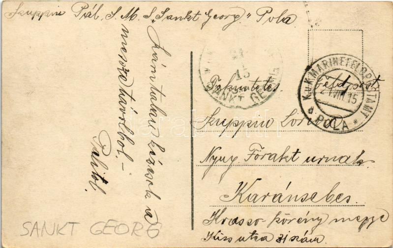 1915 Angriff des oesterr.-ung. Zerstörers "Scharfschütze" auf den Kanal von Porto Corsini am 24. Mai 1915. / SMS Scharfschütze az Osztrák-Magyar Haditengerészet Huszár-osztályú rombolója Porto Corsininél / WWI Austro-Hungarian Navy, K.u.K. Kriegsmarine art postcard, SMS Scharfschütze Huszár-class destroyer s: Tuszynski + "K.U.K. KRIEGSMARINE SMS SANKT GEORG" (EK)
