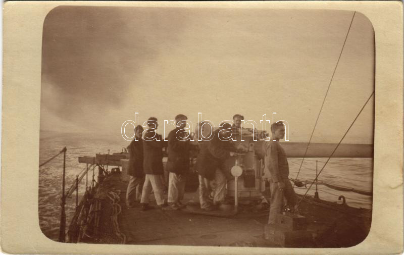 SMS Lika osztrák-magyar Tátra-osztályú romboló matrózai fedélzeti ágyú mellett kiképzéskor / K.u.K. Kriegsmarine Matrosen / SMS Lika Austro-Hungarian Navy Tatra-class destroyer, mariners with 10-cm, cal 50, stern chaser. photo