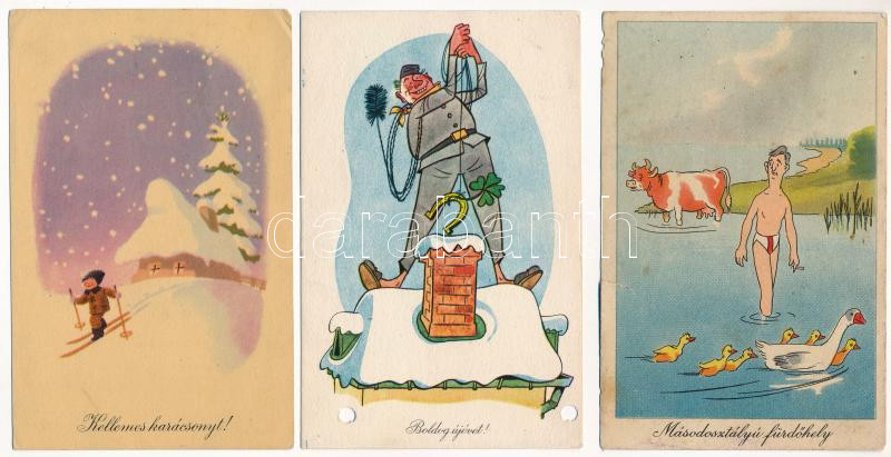 11 db MODERN magyar retro grafikai üdvözlő képeslap vegyes minőségben. Képzőművészeti Alap / 11 modern Hungarian retro graphic greeting postcards in mixed quality