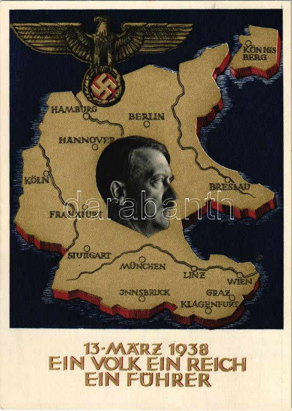 1938 März 13. Ein Volk, ein Reich, ein Führer! / Adolf Hitler, NSDAP German Nazi Party propaganda, map, swastika. 6 Ga. s: Professor Richard Klein + "Ein Volk, ein Reich, ein Führer Wien 10. April 1938" So. Stpl.