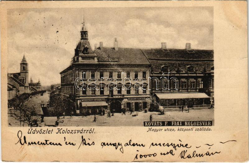 1900 Kolozsvár, Cluj; Magyar utca, Központi szálloda, Medgyesy és Nyegrutz, Biasini Sándor üzlete. Kováts P. Fiai kiadása / street view, hotel, shops (EK)