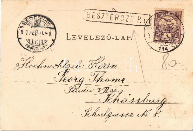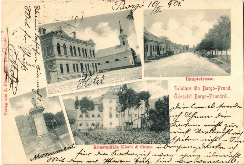 1901 Borgóprund, Borgó-Prund, Prundu Bargaului; Hauptstrasse, Kunstmühle Kisch & Comp. / Fő utca, szálloda, Kisch féle műmalom, emlékmű. J. Chencinski kiadása / main street, hotel, mill, monument + "BESZTERCE P.U." "BESZTERCZE - DEES 114. SZ. A" vasúti mozgóposta bélyegző (EK)
