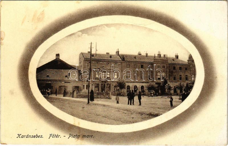 Karánsebes, Caransebes; Fő tér, Halász Nándor üzlete, gyógyszertár, Kereskedők Egyesülete. H. Perlfaster és fia kiadása / main square, shops, pharmacy, traders' association (fl)
