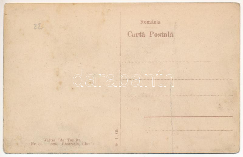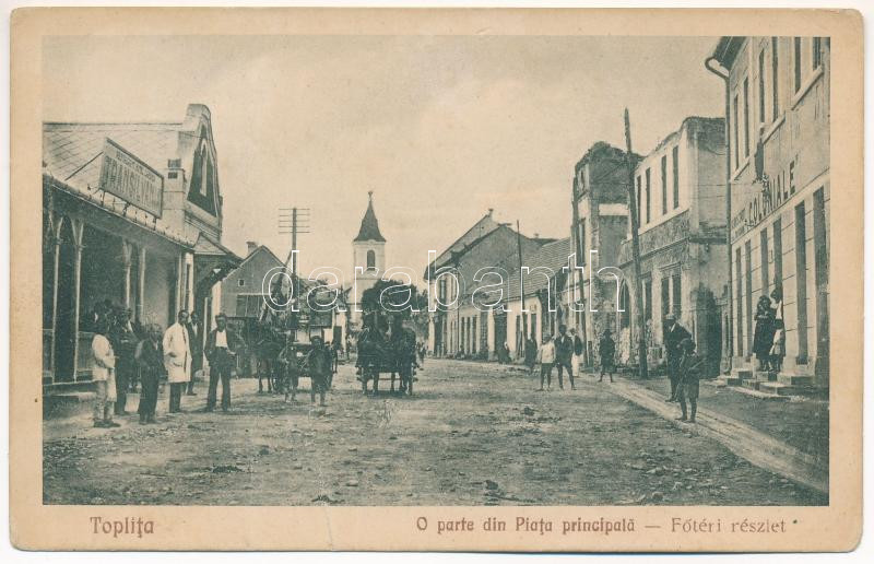 Maroshévíz, Toplita; Fő tér, templom, üzletek. Walter Ede kiadása / O parte din Piata principale, Coloniale, Transilvania / main square, shops, church, shops (fa)