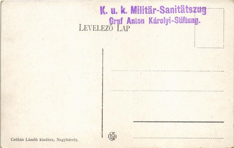 Beschreibung: Nagykároly, Carei; Gróf Károlyi kastély, park részlet. Csókás László kiadása / castle park + "K.u.K. Militär-Sanitätszug Graf Anton Károlyi-Stiftung"