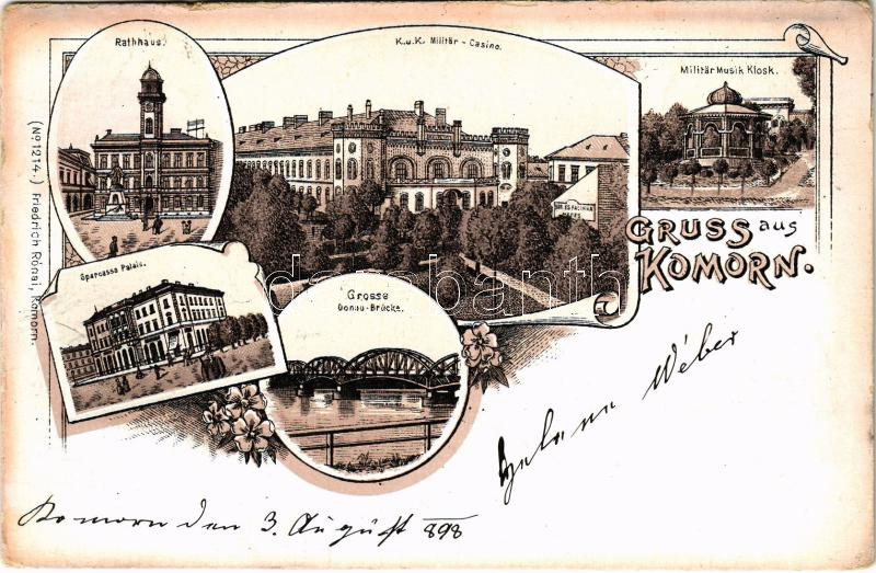 1898 (Vorläufer) Komárom, Komárno; Városháza, kaszinó, takarékpénztár, híd, kioszk. Friedrich Rónai No. 1214. / town hall, casino, savings bank, bridge, kiosk. Art Nouveau, floral, litho (EK)