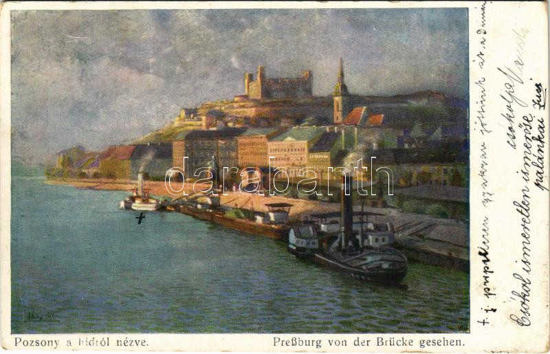 1913 Pozsony, Pressburg, Bratislava; Látkép a hídról, vár, gőzhajók / ... https://www.darabanth.com/de/451-Fernauktion/451.0/Ansichtskarten/Slowakei~2000006/1913-Pozsony-Pressburg-Bratislava-Latkep-a-hidrol-var-gozhajok-PreC39Fburg-von-der-Bruc~II2905403