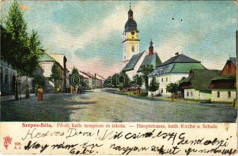 Szepesbéla, Spisská Belá (Szepes, Zips); Fő utca, Római katolikus templom és iskola. Feitzinger Ede 698. A.J. 1904/14. / Hauptstrasse, kath. Kirche u. Schule / main street, Catholic church and school (kopott sarkak / worn corners)