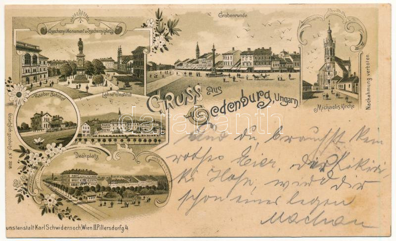 1899 (Vorläufer) Sopron, Oedenburg; Széchenyi tér és szobor, Szent Mihály templom, Deák tér, vasútállomás, Lähne intézet. Kunstanstalt Karl Schwidernoch Art Nouveau, floral, litho
