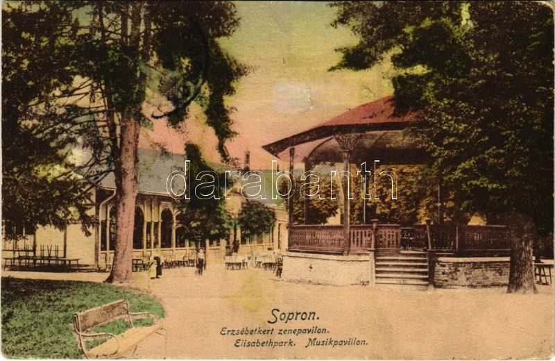 1920 Sopron, Erzsébet kert zene pavilon. Piri Dániel 765. https://www.darabanth.com/de/451-Fernauktion/451.0/Ansichtskarten/Ungarn~2000004/1920-Sopron-Erzsebet-kert-zene-pavilon-Piri-Daniel-765~II2948404