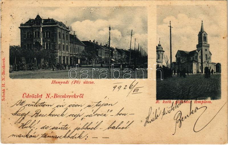 1899 (Vorläufer) Nagybecskerek, Zrenjanin, Veliki Beckerek; Hunyadi (Fő) utca, Római katolikus plébániatemplom, piac. Schenk H. kiadása / main street, Catholic church, market (fl)