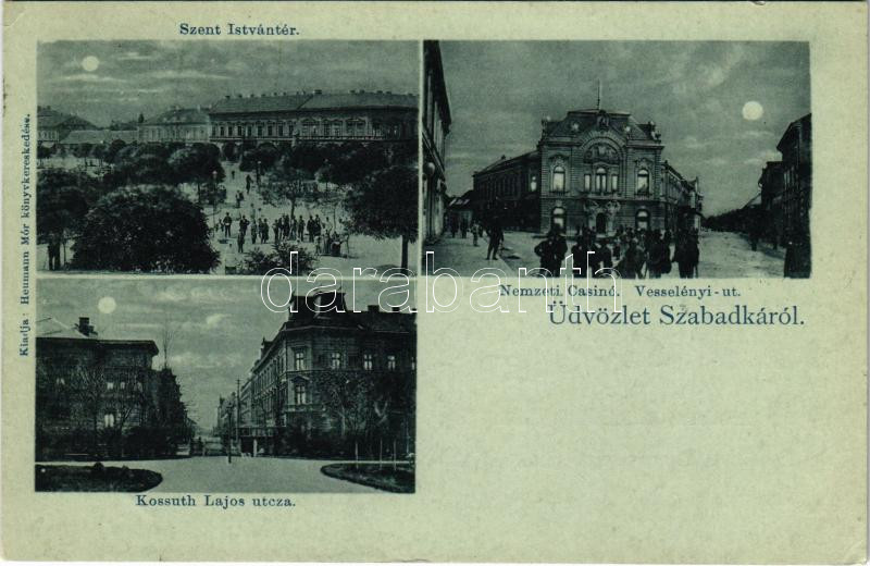 1899 (Vorläufer) Szabadka, Subotica; Szent István tér, Kossuth Lajos utca, Wesselényi út, Nemzeti kaszinó, este, villamos / square, streets, casino, tram, at night (EK)