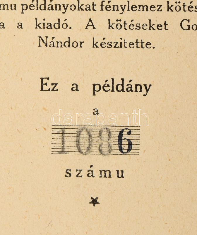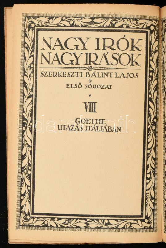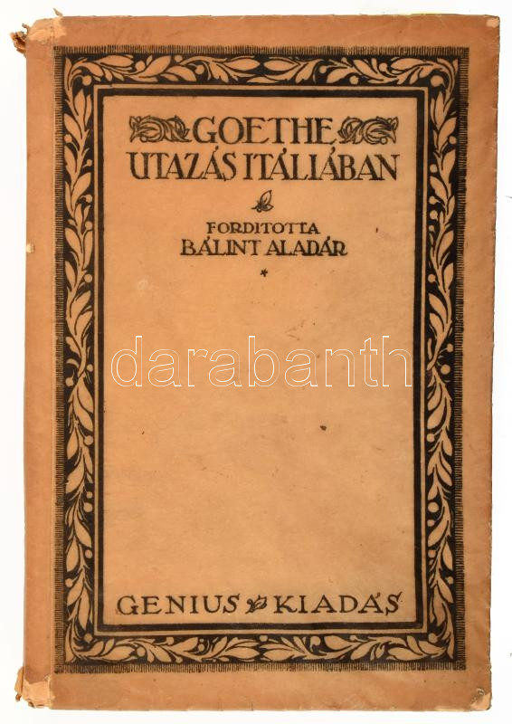 Goethe, Johann Wolfgang von: Utazás Itáliában. Ford.: Bálint Aladár. Nagy Írók - Nagy Írások I. sor. VIII. Bp.,1922, Genius. Kiadói papírkötés, a könyvtest elvált a borítótól, de a könyvtest egyben van, kissé szakadozott borítóval, a gerincen kis sérüléssel. Megjelent 1500 számozott példányban... "Ebből a könyvből az első 300 példány merített papíron készült, I-L-ig amatőr könyvgyűjtők részére Végh Gusztáv tervei szerint egész pergament kötésben, az 51-300-ig számu példányokat fénylemez kötésben hozta forgalomba a kiadó." Számozott (1086./1500) példányban.