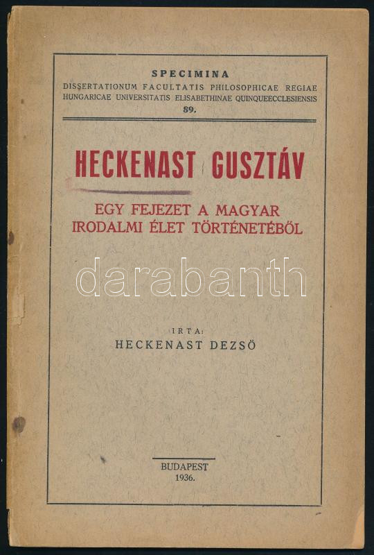 Heckenast Dezső: Heckenast Gusztáv. Egy fejezet a magyar irodalmi élet történetéből. Bp., 1936, (Spitzer Aladár-ny.), 46+(2) p. Kiadói tűzött papírkötés, sérült borítóval