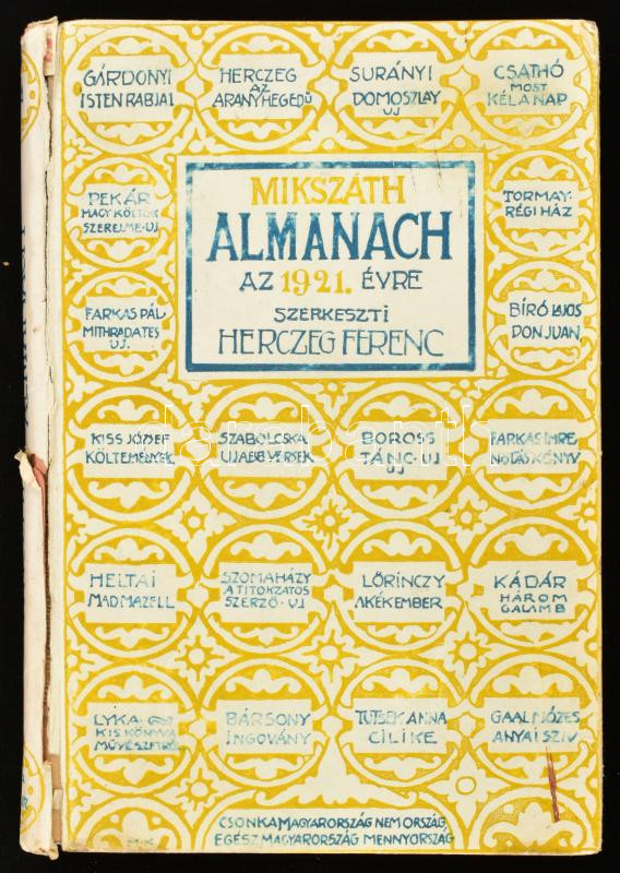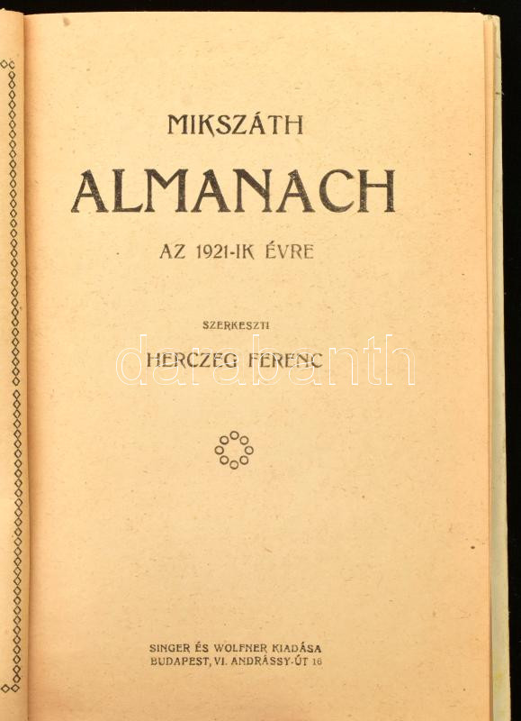 Herczeg Ferenc: Mikszáth almanach az 1921-ik évre. Bp., Singer és Wolf... https://www.darabanth.com/de/451-Fernauktion/451.0/Bucher/Bucher-Andere-kuriositaten~1000029/Herczeg-Ferenc-Mikszath-almanach-az-1921-ik-evre-Bp-Singer-es-Wolfner-Kiadoi-kartonalt-ko~II2939555