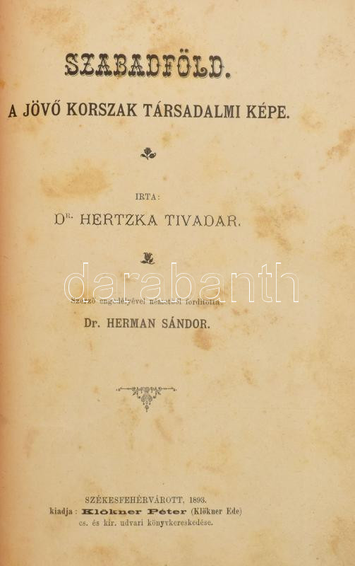 Hertzka Tivadar: Szabadföld. A jövő korszak társadalmi képe. Ford.: Dr. Herman Sándor. Székesfehárvár, 1893, Klökner Péter, (Számmer Kálmán-ny.), 438 p. Átkötött félvászon-kötésben, festett lapélekkel, kissé kopott borítóval, foltos lapokkal.
