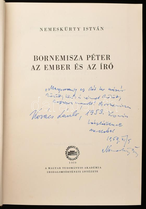 Nemeskürty István: Bornemisza Péter az ember és az író. Irodalomtörténeti Könyvtár 4. (DEDIKÁLT). Bp., 1959, MTA Irodalomtörténeti Intézete, 558+(1) p. + 1 kihajtható térkép. Kiadói egészvászon-kötés, néhány kisebb lapszéli ázásnyommal, egyébként jó állapotban. Megjelent 1000 példányban. A szerző, Nemeskürty István (1925-2015) Széchenyi-, József Attila-, Balázs Béla-díjas és Kossuth-nagydíjas író, irodalom- és filmtörténész által DEDIKÁLT példány.