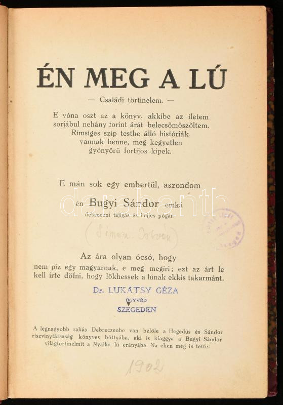 [Simon István (1860-1944)] Bugyi Sándor: Én meg a lú. Családi törtinelem. E vóna oszt az a könyv, akkibe az íletem sorjábul nehány forint árát belecsömöszöltem. Rimsíges szíp testhe álló históriák vannak benne, meg kegyetlen gyönyörü fortíjos kipek.E mán sok egy embertül, aszondom én Bugyi emlá debreceni tajigás és hejjes pógár. Debrecen,(1902), Hegedüs és Sándor, 136 p. Átkötött félvászon-kötés, kissé kopott borítóval.