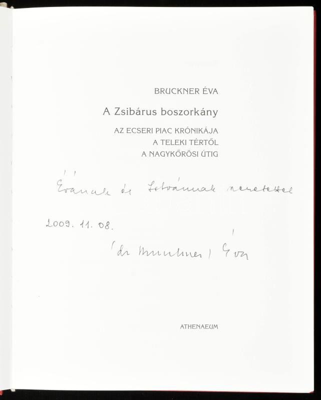 Bruckner Éva: A Zsibárus boszorkány. Az Ecseri piac krónikája a Teleki tértől a Nagykőrösi útig. A szerző, Bruckner Éva egyetemi tanár által által Haraszty Istvánnak (1934-2022), Kossuth-díjas szobrász, festőművész és felesége részére DEDIKÁLT! Bp., 2007, Athenaeum. 191 p. Gazdag fekete-fehér képanyaggal illusztrálva. Kiadói kartonált papírkötés.