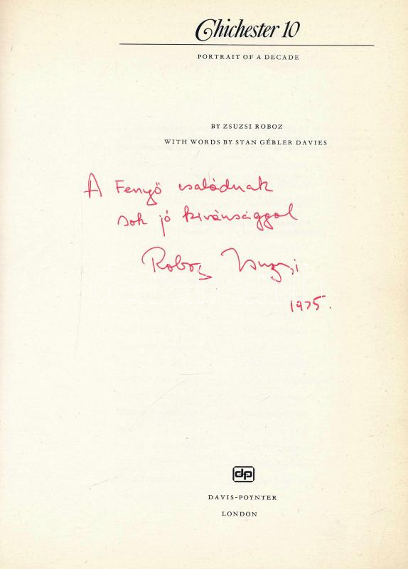 Roboz Zsuzsi: Chichester 10. Portrait of a Decade. London, 1975, Davis-Poynter Ltd. Első kiadás. Fekete-fehér képekkel, reprodukciókkal illusztrálva. Angol nyelven. Kiadói papírkötés. A szerző, Roboz Zsuzsa (Zsuzsi) (1939-2012) londoni magyar festőművész által DEDIKÁLT példány. / In English language. Signed by the author, Zsuzsi Roboz (1929-2012) London-based Hungarian painter.