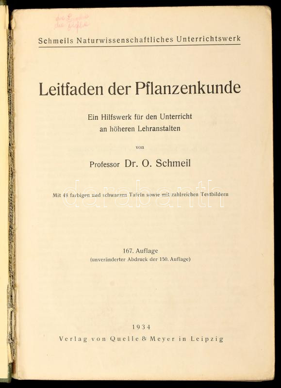 Dr. O. Schmeil: Leitfaden der Pflanzenkunde. Ein Hilfswerk für den Unterricht an höheren Lehranstalten. Schmeils Naturwissenschaftliches Unterrichtswerk. Leipzig, 1934.,Quelle&Meyer. Német nyelven. Fekete-fehér és színes illusztrációkkal. Kiadói kopott egészvászon-kötésben, hiányzó elülső szennylappal