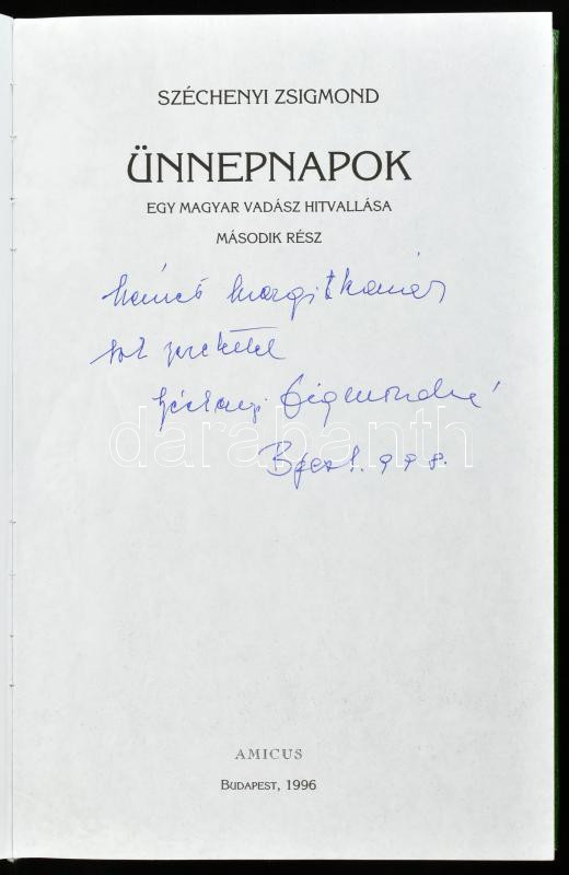 Széchenyi Zsigmond: Egy magyar vadász hitvallása (2 kötet). I. rész: Ahogy elkezdődött... II. rész: Ünnepnapok. Bp., 1994-1996, Amicus. Schell József illusztrációival. Kiadói kartonált papírkötés. Mindkét kötet a szerző felesége, Széchenyi Zsigmondné Hertelendy Margit (1925-2021) által DEDIKÁLT.