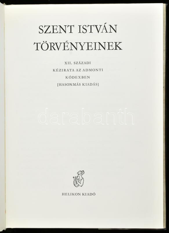 Szent István törvényei. Szent István törvényeinek XII. századi kézirata az Admonti Kódexben. A kísérőtanulmányt Györggy György, a bevezetést, a magyar fordítást és a jegyzeteket Bartoniek Emma készítette. Bp., 1988, Helikon. Hasonmás kiadás. Kiadói műbőr kötésben, nylon védőborítóban.