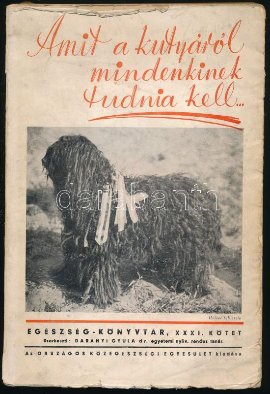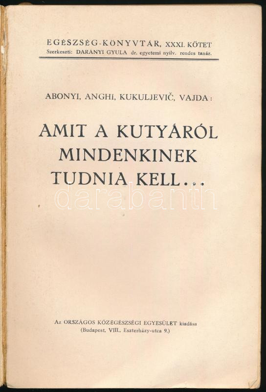Abonyi [Lajos] - Anghi [Csaba] - Kukuljevič [József] - Vajda [Tódor]: Amit a kutyáról mindenkinek tudnia kell... Egészség-Könyvtár XXXI. köt. Bp., [1937], Országos Közegészségügyi Egyesület, 165+(3) p.+ 8 (fekete-fehér képek) t. Kiadói papírkötés, viseltes, sérült borítóval, ajándékozási bejegyzéssel, intézményi bélyegzővel.