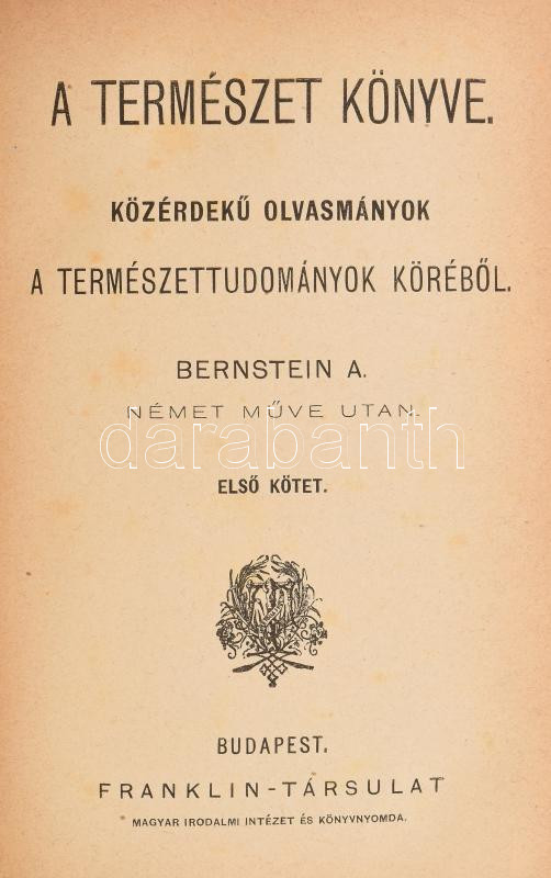 [Bernstein, Aaron (1812-1884)] A természet könyve. I.-VI. kötet. (Teljes!) 3 kötetbe kötve. Közérdekű olvasmányok a természettudományok köréből. Bernstein A. német műve után. Ford.: Dr. Toldy László, Vértesi Arnold. Bp.,1875., Franklin, Kiadói aranyozott egészvászon-kötés, sérült borítókk al