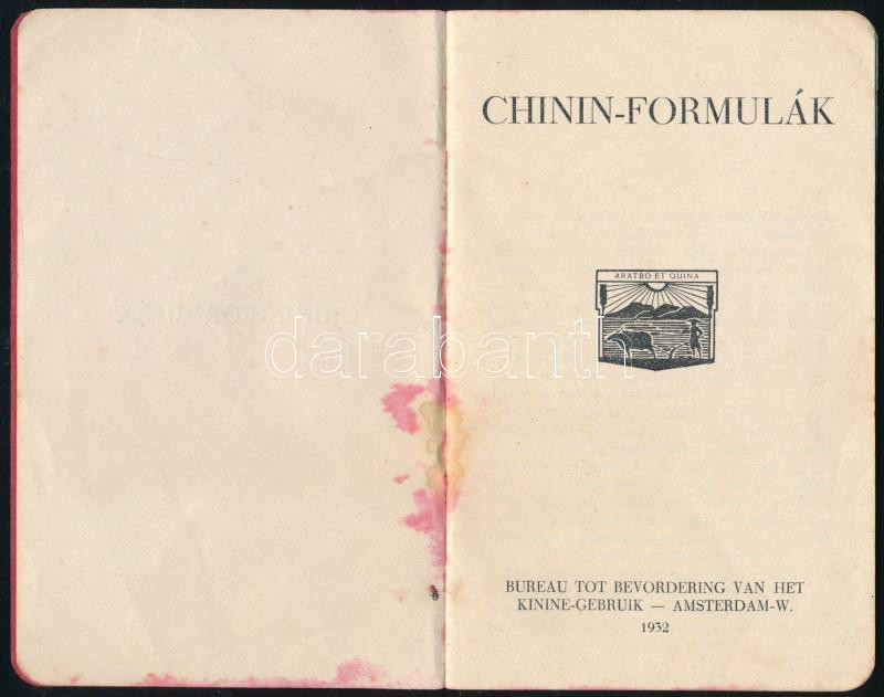 Chinin-formulák. Amsterdam, 1932, Bureau Tot Bevordering Van Het Kinine-Gerbuik,(Bp., Szent László-ny.), 32 p. Benne chinin gyógyszer receptekkel. Kiadói papírkötésben, foltos.